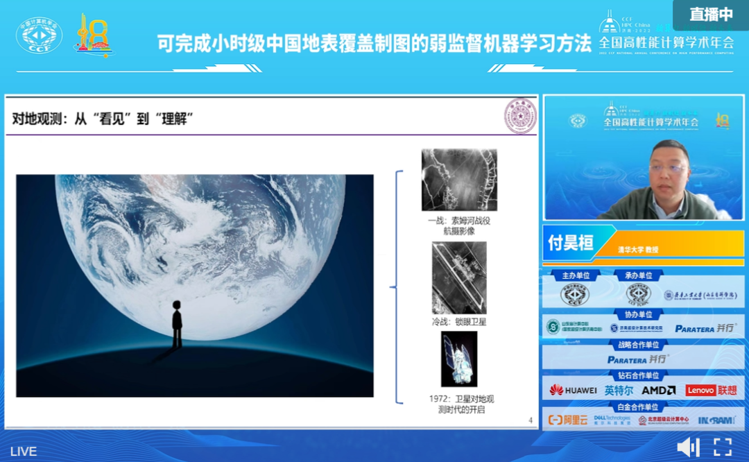 清華大學(xué)地球系統(tǒng)科學(xué)系長(zhǎng)聘教授,國(guó)家超級(jí)計(jì)算無錫中心副主任付昊桓在主題講演中基于對(duì)新一代神威超級(jí)計(jì)算機(jī)的應(yīng)用,討論了有關(guān)地表覆蓋制圖的一種高可擴(kuò)展的弱監(jiān)督分類方法,無需額外的人工標(biāo)注,即可完成大尺度的地表覆蓋任務(wù)。