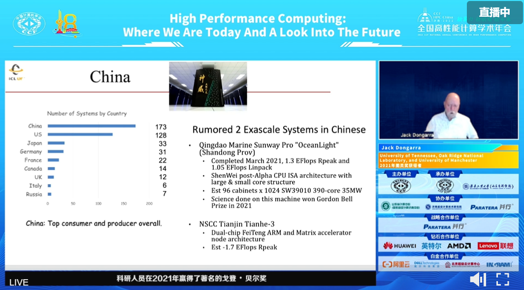 2021圖靈獎(jiǎng)獲得者、田納西大學(xué)、橡樹嶺國(guó)家實(shí)驗(yàn)室和曼徹斯特大學(xué)教授Jack J. Dongarra在報(bào)告中分享了高性能計(jì)算在過去10年里發(fā)生的變化,以及未來的趨勢(shì)可能會(huì)是什么,其中特別提到由清華大學(xué)、無錫超算等團(tuán)隊(duì)所構(gòu)建的“神威·太湖之光”軟件應(yīng)用生態(tài),已三次獲得世界超算應(yīng)用最高獎(jiǎng)“戈登·貝爾獎(jiǎng)”。