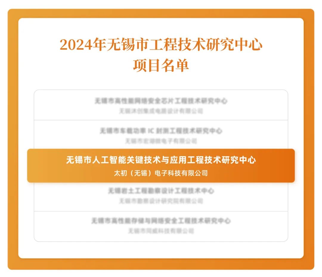 近日,無錫市科技局公布了《2024年度無錫市工程技術研究中心項目名單》。經(jīng)企業(yè)申報、資格審查、專家評審和公示認定等程序,由太初(無錫)電子科技有限公司申報的無錫市人工智能關鍵技術與應用工程技術研究中心成功入選。