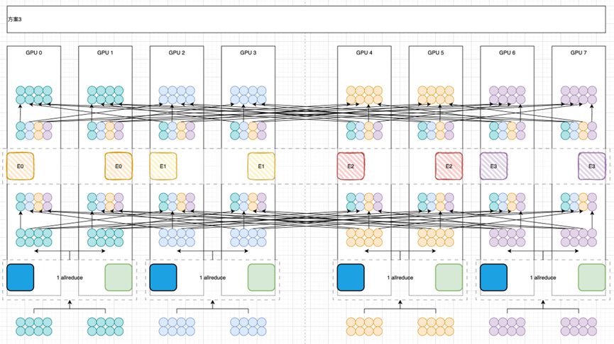 在前向計(jì)算的時(shí)候, Attention部分和之前2個(gè)方案不同,GPU0-GPU1,GPU2-GPU3,GPU4-GPU5,GPU6-GPU7之間需要進(jìn)行Allreduce通信。之后看起來(lái)在MoE部分完成2次All2All操作。細(xì)心的同學(xué)可能已經(jīng)發(fā)現(xiàn),如果按照常規(guī)的All2All操作,第一次會(huì)多發(fā)送1倍的重復(fù)數(shù)據(jù)。第二次進(jìn)行的是一個(gè)類似與上一個(gè)方案的All2All操作。 在反向計(jì)算的時(shí)候,GPU0-GPU4,GPU1-GPU5,GPU2-GPU6,GPU3-GPU7的Expert做Allreduce操作,在Attention部分做GPU0-GPU2-GPU4-GPU6和GPU1-GPU3-GPU5-GPU7的Allreduce操作。