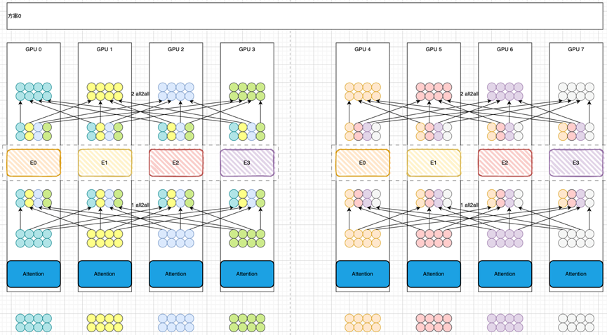 接下來(lái)讓我們稍微進(jìn)階一下。假設(shè)方案0中GPU卡的顯存并不夠。其中一種方案是將Expert維度改變成EP4-TP2,如圖2所示。單機(jī)8卡,4個(gè)專家,Attention部分(藍(lán)色)采用DP8,MoE部分采用EP4-TP2。