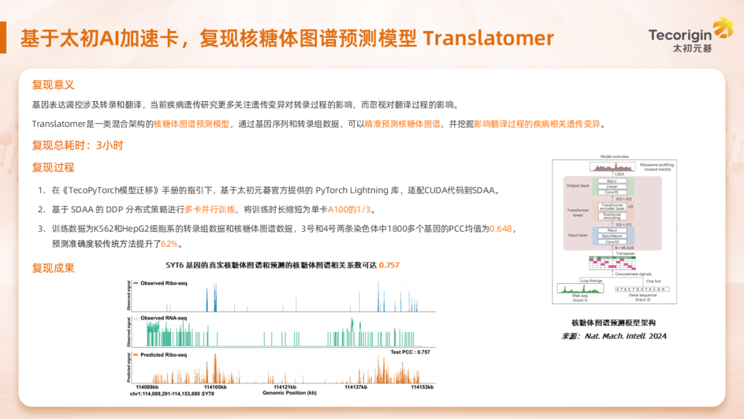 基于TecoPyTorch的高度兼容性和太初元碁已適配的PyTorch Lightning框架,團(tuán)隊(duì)成員在《TecoPyTorch遷移手冊(cè)》的指引下,3小時(shí)即完成Translatomer 模型在太初AI加速卡上的復(fù)現(xiàn)。并進(jìn)一步,在TecoPyTorch上開(kāi)啟了DDP 分布式訓(xùn)練,將訓(xùn)練時(shí)長(zhǎng)縮短為單卡A100的1/3。最終,復(fù)現(xiàn)后模型的預(yù)測(cè)準(zhǔn)確度較傳統(tǒng)方法提升了62%。