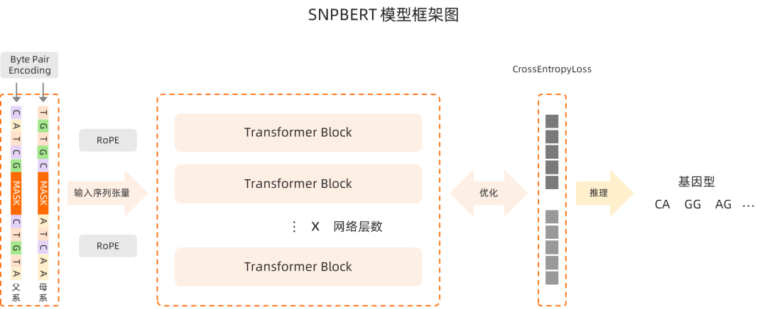 SNPBERT 模型通過(guò) Byte Pair Encoding 的 token 詞匯本進(jìn)行編碼,并在此基礎(chǔ)上采用 RoPE(Rotary Position Embedding)對(duì) token 位置進(jìn)行編碼;基于 Transformer 框架,創(chuàng)新性地引入父系/母系雙掩碼自監(jiān)督預(yù)訓(xùn)練,實(shí)現(xiàn)等位基因級(jí)的并行堿基預(yù)測(cè);并分別編碼父系與母系兩條單倍型序列,在同一位置同步掩碼并預(yù)測(cè)堿基,解碼后形成精準(zhǔn)的基因型推斷;同時(shí)基于八張?zhí)魽I加速卡的多卡并行訓(xùn)練和 FlashAttention 算子庫(kù),提升模型訓(xùn)練速度。