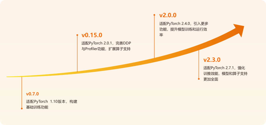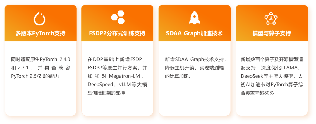 適配PyTorch 2.7.1,大幅增強算子和模型支持,強化torch compile、自定義算子擴展與分布式訓(xùn)練(FSDP/FSDP2)等功能,兼容PyTorch 2.5/2.6。