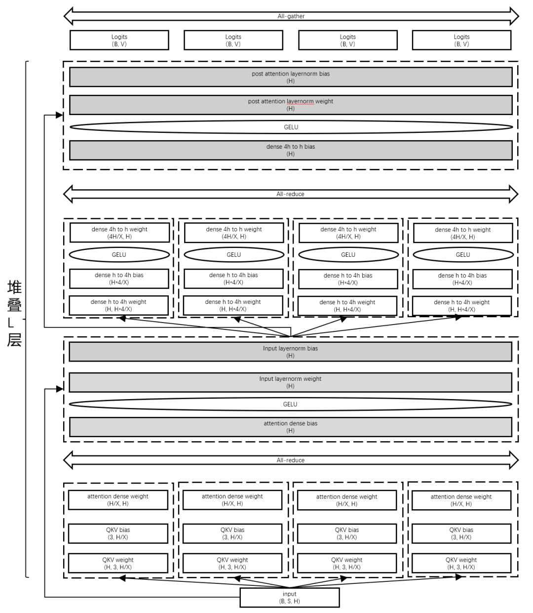 下圖展示了基于模型并行的大模型推理切分方案,通過(guò)模型縱向切分,充分利用多卡訪存/算力,并深度優(yōu)化通信算子,高效降低多卡并行推理帶來(lái)通信開銷。