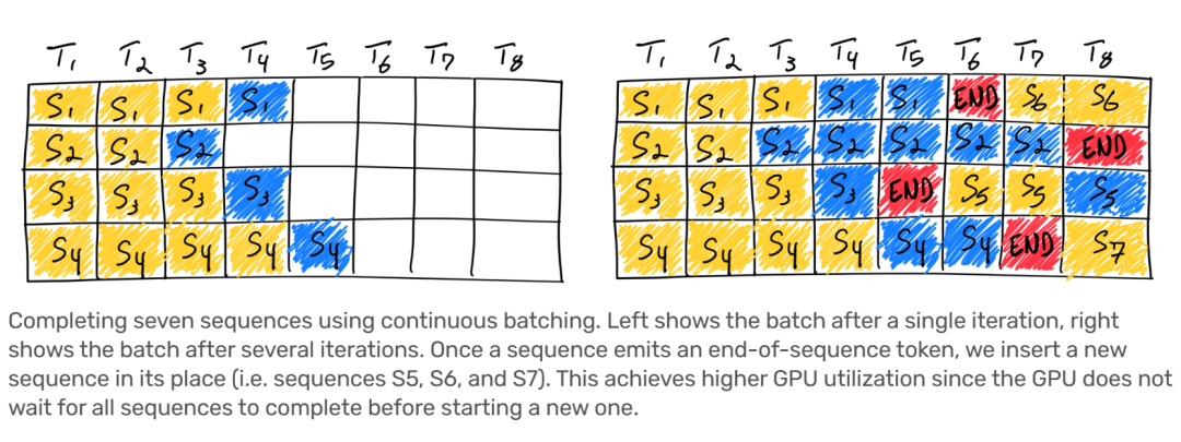 Continuous batching在進(jìn)行batch>1的推理場(chǎng)景下,一旦batch中的某一個(gè)序列推理完成,那么就可以在之后插入一個(gè)新序列,從而充分利用GPU使用率。